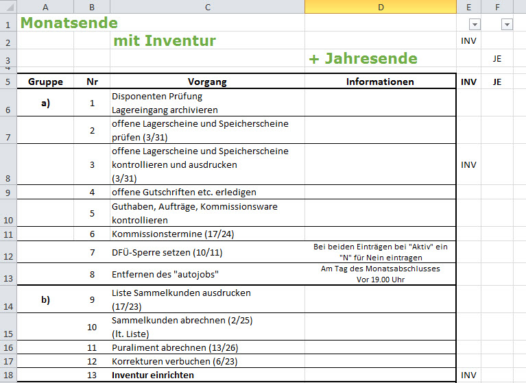 Hier lässt man in der Spalte E im Gegensatz zum "Monatsende ohne Inventur" den Haken bei "INV" drin.