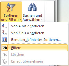 Über den Reiter Start ist ganz rechts das Menü "Sortieren und Filtern" zu finden.